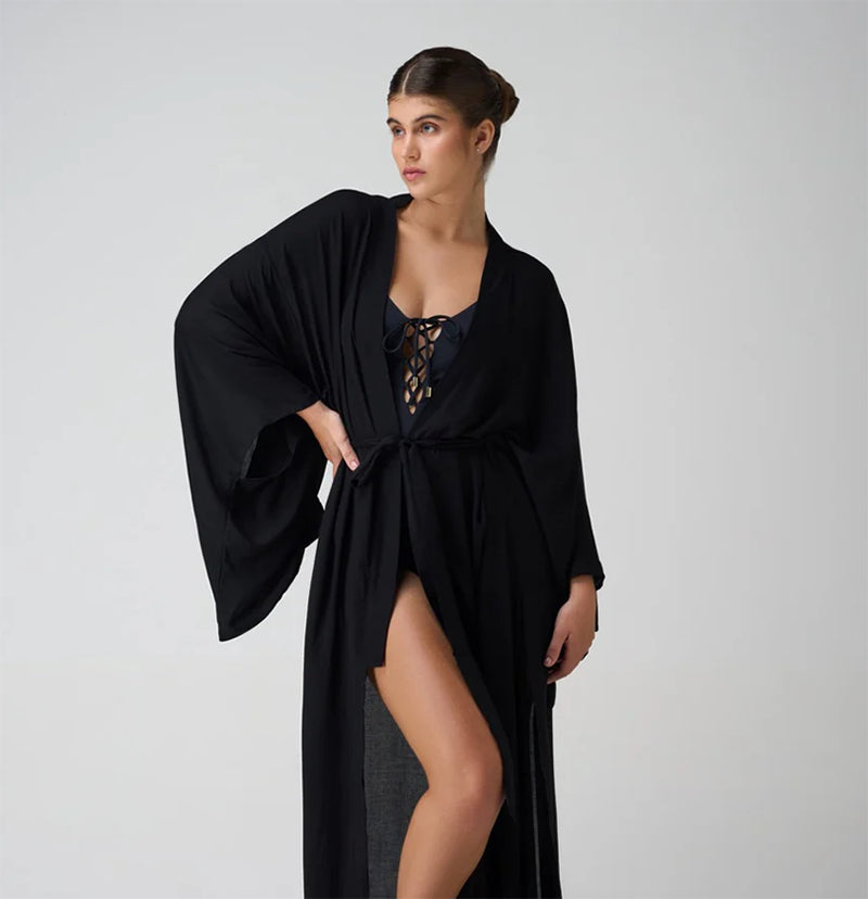 The Kami Kimono embodies effortless elegance with a Japanese-inspired design. Crafted from soft, airy Tencel fabric, it drapes gracefully over the body, offering breathable, lightweight coverage for beachside moments or city strolls. Known for its silky texture and eco-friendly properties,...